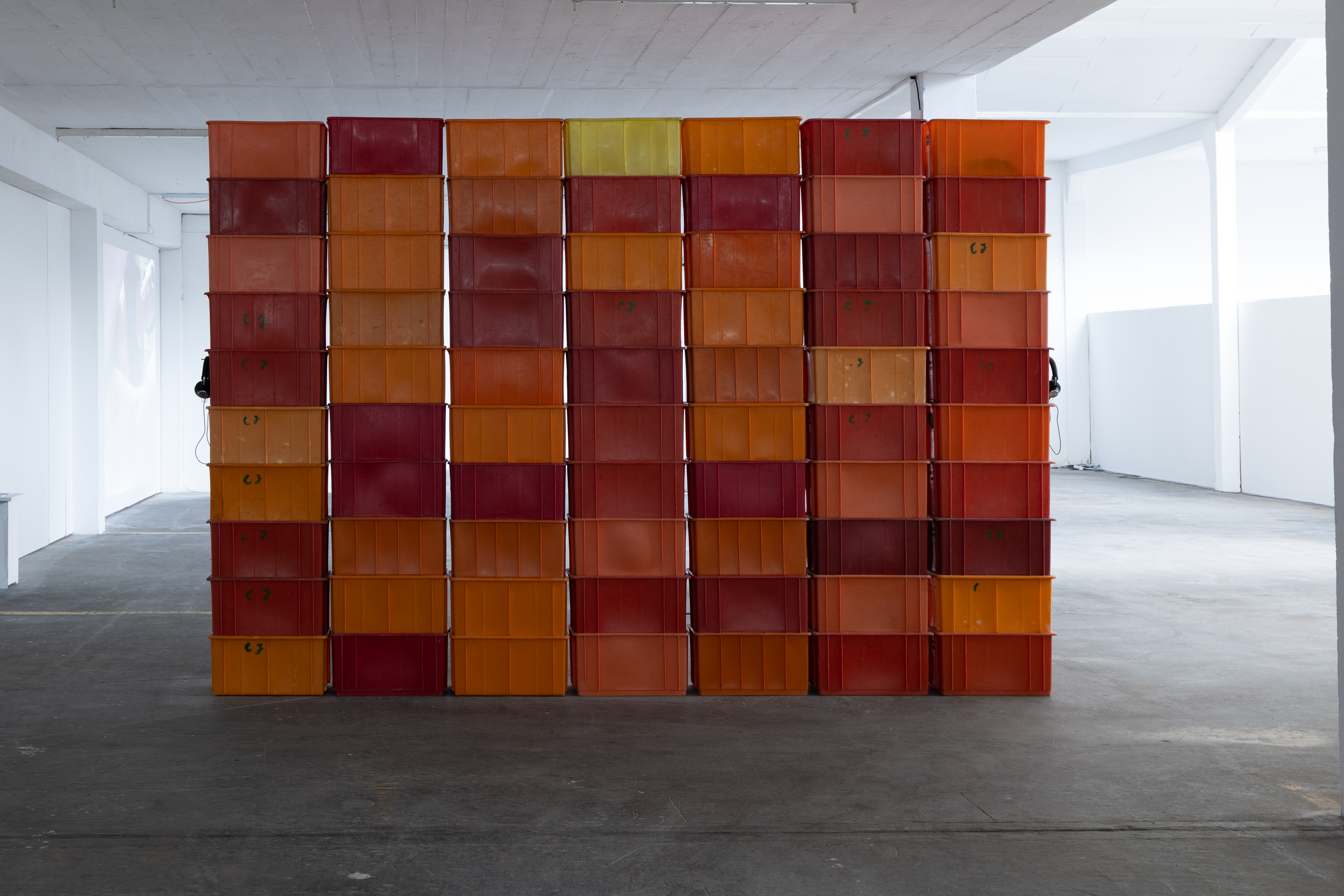 2021, installation, caisses à vendange assemblées (240 x 200 x 33 cm) et bandes sonores (durées variables, en boucle)