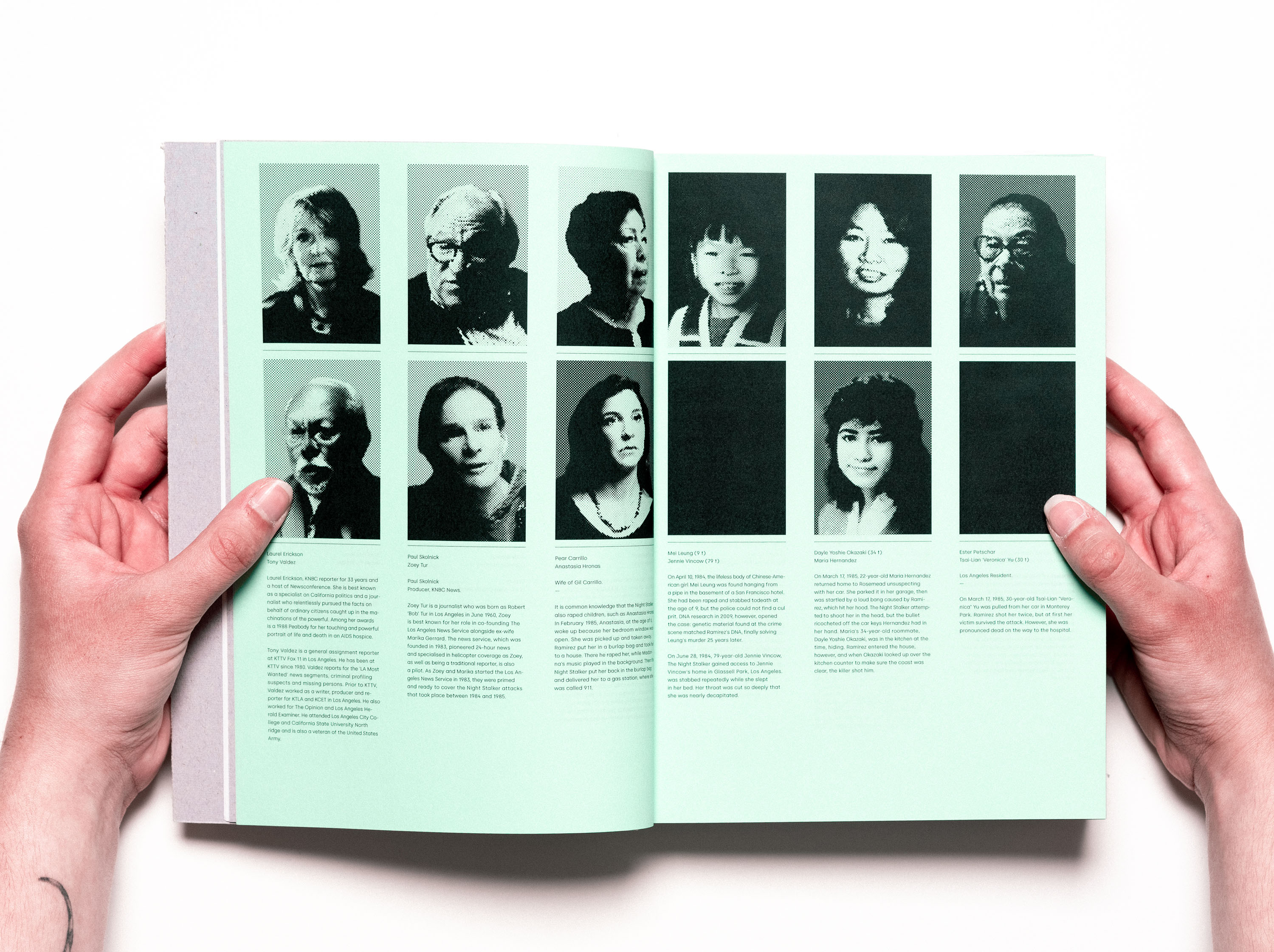 Ce projet de diplôme est une édition d’archivage qui retrace la cavale d’un tueur en série du nom de Richard Ramirez alias le traqueur de la nuit. Son activité meurtrière sévit durant l’été 1984 à Los Angeles. Sa foi envers le satanisme lui fera commettre de nombreux meurtres et viols d’enfants, de femmes et de personnes âgées. Du premier meurtre jusqu’au procès, l’ouvrage parcourt les enquêtes des deux détectives chargés du dossier. S’ajouteront aussi les témoignages des survivants et des proches des victimes ainsi que le rôle des médias dans l’enquête. Documentée avec des images exclusives teintées de vert et rouge, l’édition emprunte l’aspect visuel éditorial des années 80.