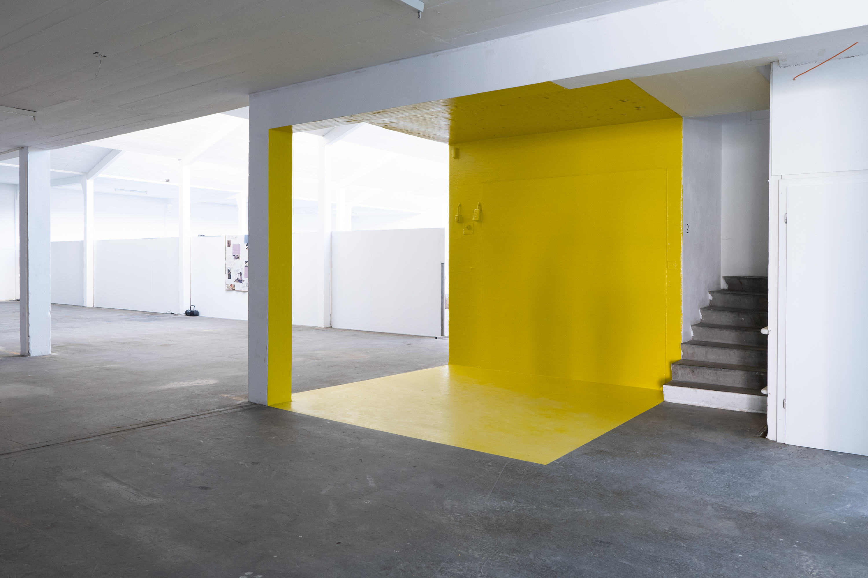 Du ruban adhésif jaune est appliqué sur toute la surface de l'espace mis à ma disposition pour cette exposition. Chaque bande est collée précisément, pour ne pas laisser d’espace entre elles. Je m’assure que le matériau est bien fixé, car avec la chaleur et son poids, il pourrait s’affaisser par endroits. Je dois alors, avec ma main, appliquer une pression sur toute la surface de la bande que je colle, pour éviter tout accident et parcourir chaque centimètre carré de la pièce avec le bout de mes doigts.
